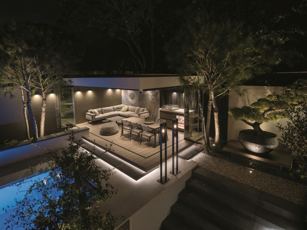 Door alle hoogteverschillen gebeurt er zoveel dat de tuin groter lijkt dan de circa 480 m² die hij is. Dat komt ook door de plaatsing van een vlonder bij het zwembad, achterin de tuin. Van daaraf is de gehele zijtuin te overzien, totaal anders qua beleving en perspectief dan vanuit de woning of vanaf het balkon. Pas later in het proces ontstond bij de opdrachtgever de wens om die vlonder te overkappen. “Voor een maximale lichtinval kozen we hier voor een lamellendak.” Weer later ontstond de aanvullende wens om de ruimte met een glazen schuifwand rondom af te kunnen sluiten om er daarna een buitenkeuken inclusief eettafel in te plaatsen.