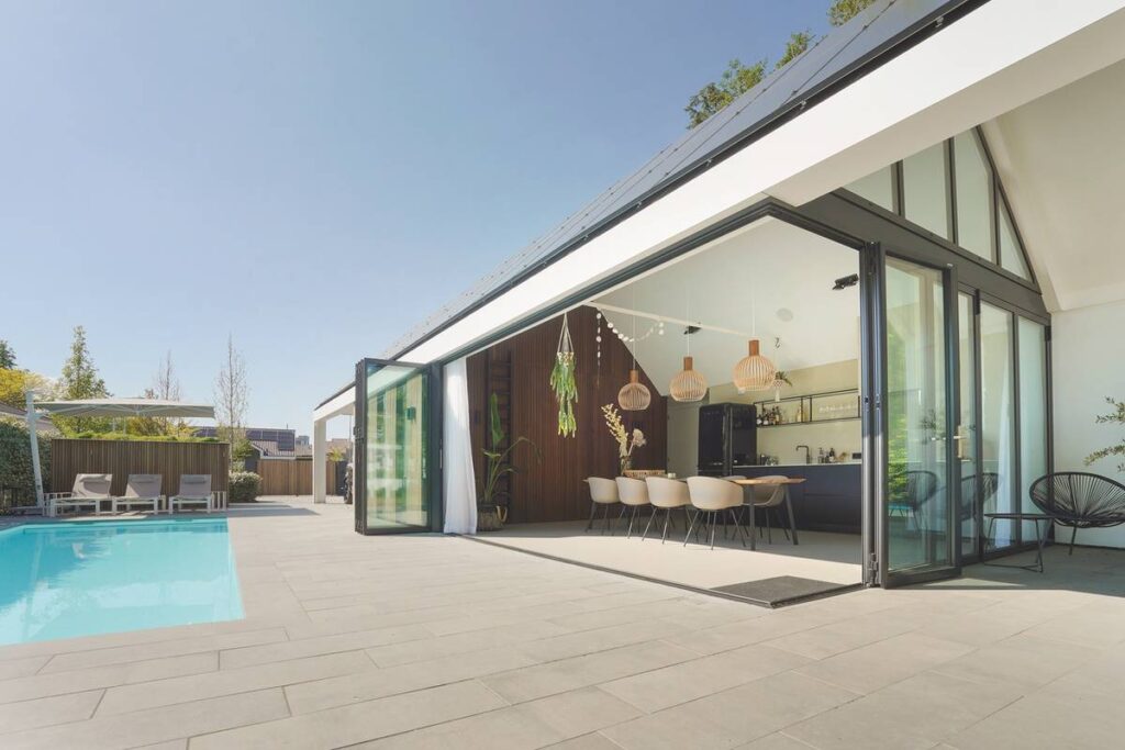 “This is a special green site in the city center of Nijkerk, almost 800 m in size,” says designer Kees van Grootheest of De Kunst van het Scheppen. The first part of the garden begins at the house with an extended eaves connected to the facade. At the spacious terrace, a four-meter-long hedge of gray-leaved Elaeagnus ebbingei keeps waste containers and bicycles out of sight. In order to get the spacious feeling, the first part of the garden has been lowered. “A more than 20 meters long ‘runner’ made of wood-free Millboard planks ‘floats’ over the lowered lawn.” This runner is surrounded by the grass, followed by a varied planting. White aluminum pergolas have been built over the runner, overgrown with wisteria. The organic shapes of the planters are striking. “These reinforce the clean lines and vice versa.” In the middle part of the garden is a swimming pool with a jacuzzi, followed by a pool house with open kitchen and sauna. Sliding doors ensure that a part of the walls can be opened completely. “For the pleasant summer evenings.” Here again a hedge of gray-leaved Elaeagnus. “This one enhances the Mediterranean feel.” In the third part of the garden, at the back, an automatically opening gate gives access to the plot. The large gravel area here provides ample parking space. “Necessary because the garden is in the center of town.” The gravel, light in color and fine in structure, lies in honeycomb mats so that it stays in place. This third part of the garden has beech hedges. “In the back of the garden, evergreens are less important.” Groups of Rhododendron serve as filling. “In winter, the dark green foliage contrasts nicely with the brown-red, dried leaf of the beech.” The trees here are ornamental pears. “Profuse blooms in spring, beautiful colour in autumn.” The garden lighting – made by Nexxt! Lightning – leads the way in the dark and creates a warm atmosphere. An invitation to enjoy the great outdoors in the evening into the late hours. “Holiday in your own garden.”