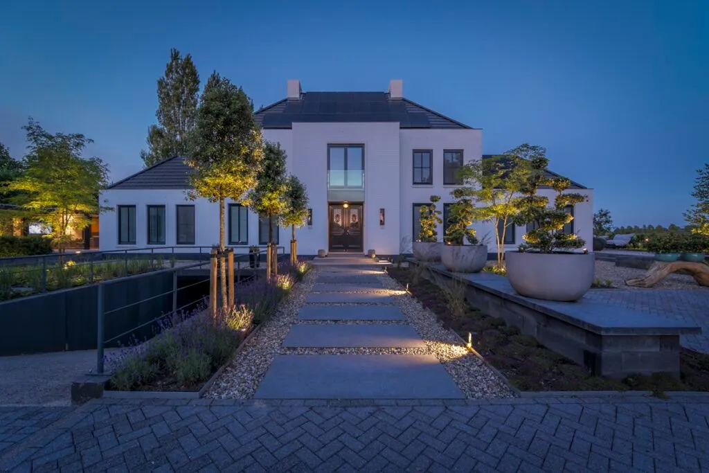 Een belangrijke voorwaarde bij de aanleg van de tuin was dat die ruimtelijkheid behouden moest blijven. “Er loopt hier veel wild en dat mag niet gestoord worden”, vertelt Roald van Genderen van ROALD Tuindesign. Daarom ook concentreerde hij zich op de vier zijden van de woning. Tegen elke gevel kwam een tuindeel met een geheel eigen functie en sfeer. Roald werkte bij deze opdracht nauw samen met Byzonder Buyten die de verschillende bestratingsmaterialen én verlichting leverde. Aan de voorzijde van de woning was de oprit al bestaand. Deze is ruim vanwege het vele bezoek, maar ook omdat de entree van de ondergrondse kelder goed bereikbaar moest zijn. Roald veranderde met name de sfeer richting de voordeur. “Ik heb veel groen toegevoegd, het geheel chiquer gemaakt. Zonder in te leveren op functionaliteit.” Het pad bestaat uit grote Schellevis betontegels in de maat 1 x 2 meter. “In verhouding met de omgeving. Alles is hier groot.” De tegels zijn omgeven door grind dat al aanwezig was, maar dat hij aanvulde met extra grof grind, ook weer in verhouding met de rest. “Grof grind blijft ook beter op zijn plek. Daarnaast bevordert het de regenwaterafvoer.