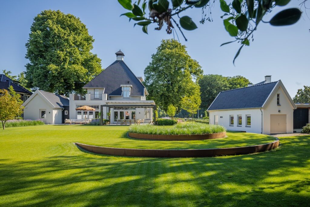 Rondom de bestaande woning werd een volledig nieuwe tuin ontworpen door Menno Boer tuin & landschap en gerealiseerd door Evink Hoveniersbedrijf. Het bedrijf heeft een vast team van enthousiaste vakmensen dat streeft naar perfectie. “Het grote voordeel is dat we alles zelf uitvoeren, zoals hier van hekwerk tot beregening en van het bouwen van de carport tot het aanleggen van de tuinverlichting”, vertelt Jan Evink. Bij dit project werd op vrijwel elke discipline een beroep gedaan.