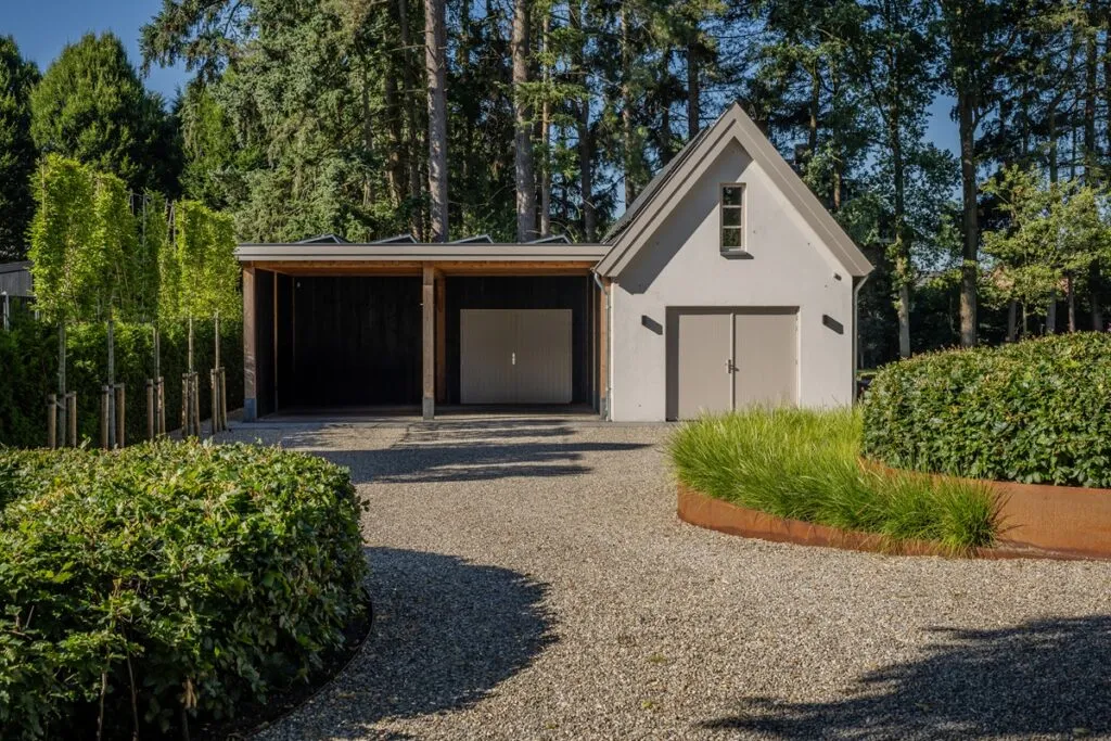 De oprit bestaat uit Moraine split, opgesloten in kunststof grindmatten van ECCOgravel zodat het goed op de plaats blijft. “Het split ligt op een ondergrond van puingranulaat. Voor de stevigheid en om regenwater makkelijk door te laten.” De oprit loopt lichtjes af richting de twee carports. Beide zijn net als het bijgebouw een ontwerp van Evink Hoveniersbedrijf. De carports zijn van douglashout. Van Noesk maakte alles op maat en de hoveniers van Evink zetten alles in elkaar. “Alles op de ambachtelijke manier, met solide pen-gat verbindingen.” Links ervan, voor de privacy, staan vijf leibomen van haagbeuk, Carpinus betulus. “Vroeg in het voorjaar al uitlopend en met een fraaie herfstverkleuring.”