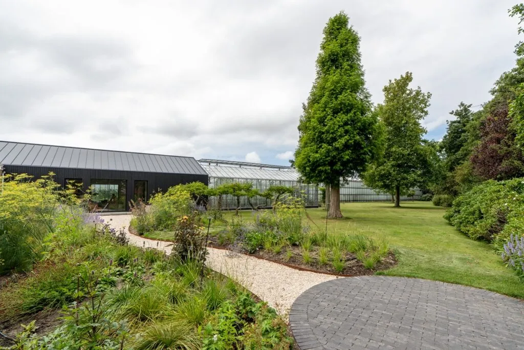 De tuin oogt ruimtelijk vanwege het grote gazon aan de rechterzijde. Hier staat een forse Metasequoia glyptostroboides en tegen de kas is er een bescheiden boomgaard. “Het lopen over het pad is een beleving, de slingervorm dwingt om links en rechts te kijken, waar het naartoe leidt is nog een verrassing. Pas aan het einde realiseer je je dat je voor de entree van het atelier staat.” Hier en daar is er een verbinding gemaakt met het grote gazon. “Dat maakt het organisch sterker.” Om de entree extra cachet te geven liggen er tegen de gevel drie forse Oud Hollandse tegels van Schellevis in de maat 200x100x10 cm.