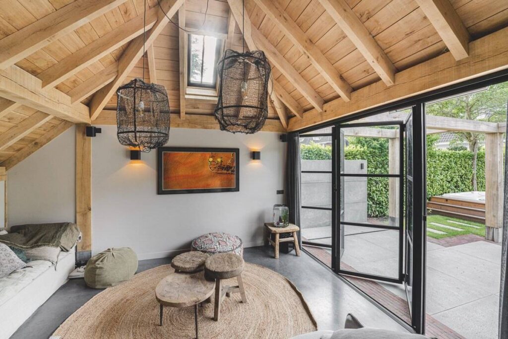 De tuinkamer is te openen met vouwdeuren, zodat het terras letterlijk en figuurlijk een verlengstuk van de woning wordt. De volledig geïsoleerde vouwdeuren zijn gemaakt van metaal en aan de buitenzijde voorzien van stopkit. In de tuinkamer bevindt zich een luxe keuken met vaatwasser, een oven van Gaggenau en een Bora-kookplaat met geïntegreerde afzuiger. Het blad is van Belgisch hardsteen met daarin een massieve wasbak. Ook een woonkamer, badkamer, toilet, slaapruimte en techniekruimte ontbreken niet. Daarnaast zijn er twee tv’s en Sonos-speakers aanwezig. Bijzonder is bovendien de vide, die in veel projecten van De Tuyn-kamer terugkomt. “Je kunt er een bed op zetten, zodat het voor de kinderen geweldig is om hier te logeren.” Nico kijkt met een goed gevoel terug op het project. “De bewoners waren niet alleen tevreden over de tuin(kamer), maar ook over de communicatie tijdens en na de werkzaamheden.” Ook de totale ontzorging sprak ze aan. Van de planten en jacuzzi tot het ontwerp van het bijgebouw. “Maar ook voor de elektriciteit, wifi en het loodgieterswerk kunnen ze bij ons terecht. Zelfs de gordijnen worden door ons geleverd. Dat de tuin ook nu nog compleet door ons wordt onderhouden, is voor ons