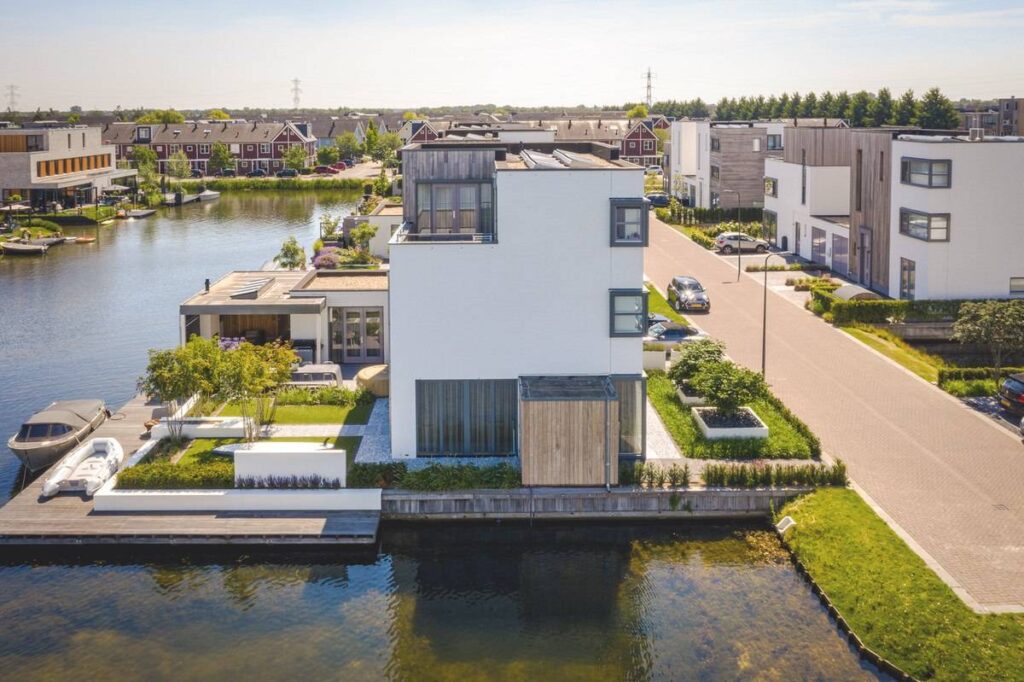 In deze nieuwbouwwijk in Rosmalen zijn alle ‘eilanden’ waarop de woningen staan aan drie zijden omgeven door water. In welk huis je ook woont, water is overal zichtbaar, altijd dichtbij. Alle huizen werden opgeleverd met dezelfde beschoeiingen en basisvlonders, de invulling van de tuin was voor iedereen vrij. Tuinontwerper Björn Meulenberg kreeg het verzoek zowel de voor- als achtertuin van deze woning, aan het einde van een doodlopende straat, vorm te geven. De wens van de eigenaren was een tuin passend bij de woning zodat zich één geheel zou vormen. “Daarom heb ik de witte kleur van de woning terug laten komen in de lijnen van het gebruikte polyester en zijn de planken in de tuinkamer – Frakè Noir – dezelfde als die aan de woning.”